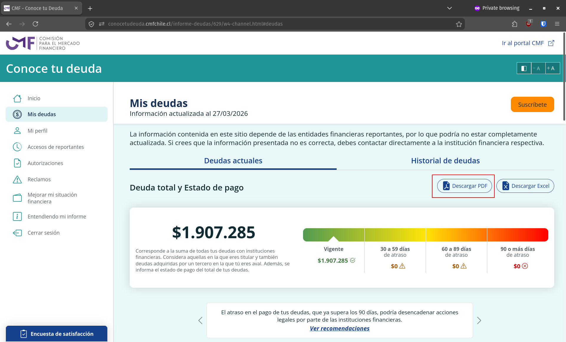 - Haz click en el botón "Descargar PDF" de la sección "Deudas actuales".